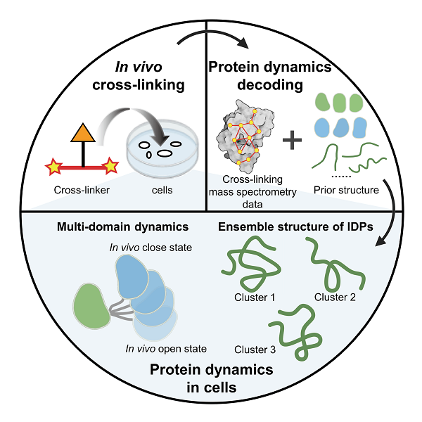 近期,中国科研实验室EVO视讯官网与大连化物所合作,提出一种利用原位化学交联-质谱技术(in vivo XL-MS)结合结构计算与模拟研究细胞中蛋白质动态结构的策略。该策略从蛋白质结构的先验信息(包括核磁结构、晶体结构和AlphaFold2预测的结构等)出发,将in vivo XL-MS取得的距离约束与多种结构计算方法结合,用于多种细胞内蛋白质结构重构,重点研究了多结构域蛋白质和天然无序蛋白的动态结构,有助于加深对细胞微环境中蛋白质发挥功能的分子机制的理解。该研究成果发表于《德国应用化学》(Angew. Chem. Int. Ed.