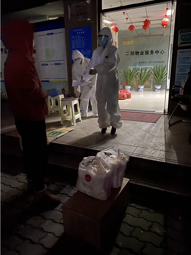 从筛选商家和统计小区居民需求,到整理分发物资,每天早上7点就开始接打电话,统计。匆匆吃完早餐,她又独自一人开车到附近的中百超市,早早的排队购买猪肉、鸡蛋、蔬菜等物质。有人要瘦肉,有人要五花,有人要排骨,分量多、样式多,各种需求她都用小本本一一详细记录。每次都早早的在肉类柜台等候,有时候去的太早,处理肉品的师傅还在将一整块猪肉切割分类,她就守在旁边,在超市封闭的空间里,戴着厚重,在正常环境都呼吸有阻的口罩和防护服一等一个小时。有时候超市的份额不够,她一天要跑好几趟。每份物质都重达5斤以上,她本就身材娇小,初期的采购,从购买、分类、装车、卸货、分发,她都独自完成,每次分发,要在社区里忙碌近9个小时。从下午1点不断忙到晚上9点多。因为怕人多聚众会有传染的风险,于是她按照时间段,有条不紊的通知大家陆续取货,还不忘嘱咐大家保持合理的安全距离。因为身穿防护服受限,在这期间,她没时间吃饭,不敢去洗手间,不敢离开发放场地,就怕有人来了找不到人领取。“他们在外面待的时间越长越危险,所以得最高效的让大家领到东西,同时安安全全的回家才行,真的很担心有人因为领取物资被感染了”。 每次回到家,都浑身湿透,饥肠辘辘,她时刻关心他人的风险,而自己却在最危险的一线从早到晚,无怨无悔。